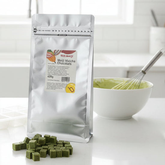 This chocolate is rich in the natural flavor of matcha, with a strong matcha aroma, a slightly astringent aftertaste, a balanced bitterness, and a sweet but not cloying tea flavor. It easily blends with other ingredients simply by melting, making it perfect for dessert making!